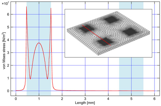 The von Mises stress on the multisensor chip’s top surface caused by a pressure of 100 kPa applied to one sensing element, depending on the position along the line through the middle of the diaphragms of that sensing element and an adjacent sensing element (see the red line in the inset); the light blue areas denote the widths of the two sensing elements’ diaphragms. The inset shows the picture of the chip with the mesh used for simulations.