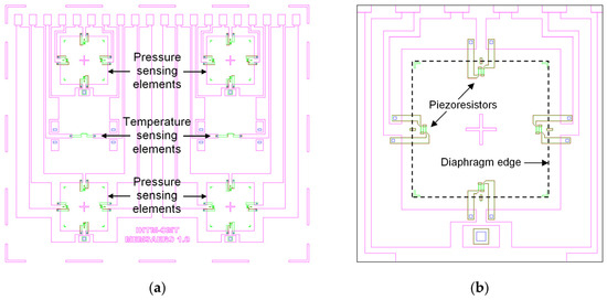 The layout of the multisensor chip is shown in Figure 3a [14]. Its overall dimensions are 8.3 mm × 7 mm × 0.4 mm. In addition to four pressure-sensing elements and two temperature-sensing elements, it contains metallic interconnects and wire-bonding pads. One of the design requirements was to place all the wire-bonding pads along one edge of the chip in order to facilitate making connections between several chips with electronic circuitry on a printed circuit board. Figure 3b is a magnified detail showing one pressure-sensing element [14]. The dimensions of its diaphragm are 1 mm × 1 mm, and the diaphragm thickness is 20 μm. During the development of the pressure-sensing element structure, optimal locations for the integration of diffused piezoresistors were studied. The location where a piezoresistor is diffused in the square diaphragm of a precisely determined thickness has been optimized by simulations and confirmed experimentally. The piezoresistor’s placement at precisely defined distances from the edge of the diaphragm, in the lateral and tangential directions, results in high sensitivity and exceptional linearity up to the burst pressure.