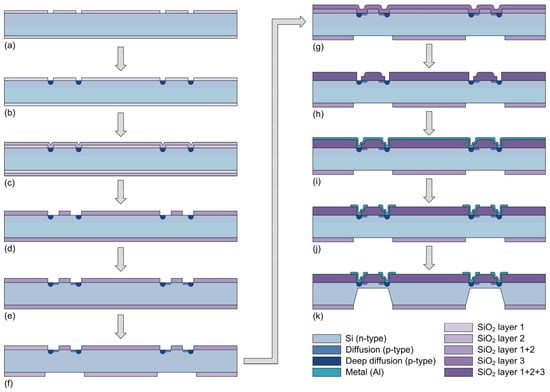 The sequence of the chip fabrication processes: (a) etching of SiO2; (b) deep diffusion of p-type impurities; (c) oxidation; (d) etching of SiO2; (e) diffusion of p-type impurities; (f) etching of SiO2 on the bottom side of the chip; (g) oxidation; (h) etching of SiO2; (i) deposition of the Al layer by sputtering; (j) etching of Al; (k) forming of the pressure-sensing elements’ diaphragms by the etching of Si; (the drawings of the chip are not to scale).