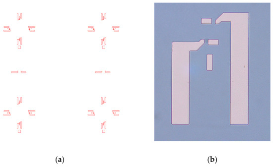 Finally, the sputter deposition of aluminum in high-vacuum conditions at the pressure of 2 × 10−4 Pa was performed. Then, a photolithography step was performed by using the TOP_4 mask for the definition of metallic interconnections, as shown in Figure 9a,b.