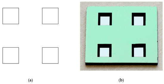 On the bottom side of the wafer, the photolithographic step using the BOT_1 mask for the definition of the Si diaphragm was performed. This photolithographic step was carried out using the EVG 620 double-sided mask aligner (EV Group Europe & Asia/Pacific GmbH, St. Florian am Inn, Austria). The accuracy of the alignment of masks on the top and bottom sides of the wafer was approximately 1 μm. This step is very important because it defines the position of the piezoresistors near the diaphragm edges. Figure 7a shows the layout of the BOT_1 photolithography mask, and Figure 7b shows the photograph of the bottom side of the fabricated chip, with etched diaphragms of the four pressure-sensing elements.