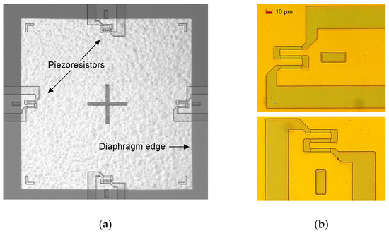 Figure 10a shows the photomicrograph of the etched diaphragm with four piezoresistors, as well as their positions relative to the diaphragm edges. This image was taken in infrared light by using the AML AWB-04 Aligner Wafer Bonder (Applied Microengineering Ltd., Oxfordshire, UK). Figure 10b shows photomicrographs of a radial and a tangential piezoresistor.