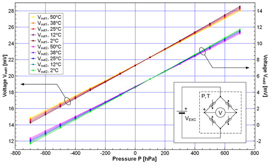 Preliminary characterization of the chip in terms of the dependence of the pressure-sensing elements’ output signal on the applied pressure and temperature was performed in the following manner. The pressure-sensing elements were connected to a constant voltage source (Agilent E3649A programmable DC power supply, Agilent Technologies, Inc., Santa Clara, CA, USA) that provided the sensor excitation VEXC = 2.5 V. The output voltages of two pressure-sensing elements (Vout1 and Vout2) were measured at several pressure and temperature values (using the Agilent 34410A digital multimeter, Agilent Technologies, Inc., Santa Clara, CA, USA). The schematic diagram is shown in the inset of Figure 12. The applied pressure values were in the range of −700 hPa to 700 hPa (set using the Mensor APC 600 automated pressure calibrator, Mensor LP, San Marcos, TX, USA), and the temperature varied from 2 °C to 50 °C (set using the Heraeus Vötsch VMT 04/140 temperature chamber, Heraeus Vötsch GmbH, Balingen, Germany). The results are presented graphically in Figure 12. It can be concluded from the diagram that, apart from the difference in the output offset values (due to fabrication imperfections), the two sensing elements are well-matched in terms of pressure sensitivity and temperature dependence, which is important for the overall measurement performance of a multichannel system. Our measurement results indicate that the difference in pressure sensitivity is less than 2% (at 25 °C), while in the case of single (discrete) sensors, the difference can be as high as 10%. Additionally, the difference in the temperature dependence of sensitivity is less than 2%, while it can be more than 10 times higher in the case of discrete sensors.