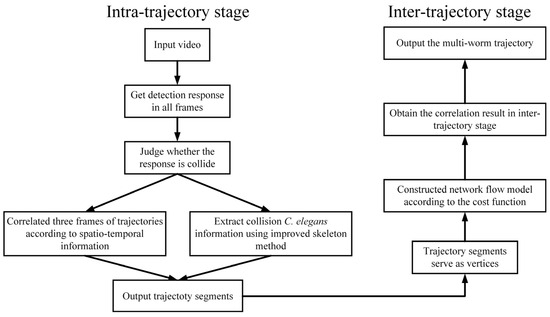 The proposed method for tracking worms is illustrated in Figure 1, and it can be divided into the intra-trajectory stage and inter-trajectory stage. In the intra-trajectory stage, the responses of the worm in all frames are initially obtained, and the responses of the worm that are occluded are extracted separately. The processing of colliding and non-colliding worms employs different strategies, and the response results of every three frames are correlated to obtain trajectory fragments. Subsequently, in the inter-trajectory stage, the trajectory fragments are used as vertices to construct a network flow model, which is solved to obtain the multi-worm trajectory.