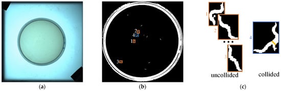 Figure 2 illustrates the detection and colliding worm judgment within the video frame. Figure 2a depicts the original video frame, and a morphological method is employed to derive a binary image of the worm population [13], as illustrated in Figure 2b. At this point, the blob in Figure 2b is the detected worm response, and the centroid and skeleton of the worm can be extracted. In order to classify the worm responses into collided and uncollided responses, the area threshold is introduced. When the area of a worm response is greater than , it is classified as a collided response; otherwise, it is classified as an uncollided response. Four blobs are selected for demonstrating the judge method in Figure 2b, as shown in the four rectangles in the figure, where the orange rectangle is the uncollided worm response, and the blue rectangle is the collided worm response. The magnified view is shown in Figure 2c, where the yellow area in rectangle 4 is the collision area of the worms. In this paper, the area of the worm individual is about 150–250 pixels, so the is set to 300. It is worth noting that different values of should be chosen when applied to different datasets.