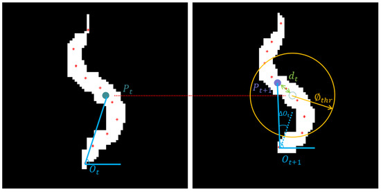 In order to obtain the trajectory fragments of the non-colliding worm, the center skeleton points of the adjacent frames are matched according to the temporal and spatial characteristics of the worm [14]. Figure 3 illustrates the binary images of the worm in frames and , as shown in the left image and the right image. Wherein, and represent the center points of the skeleton, denotes the Euclidean distance between and , and represents the distance threshold. The movement direction of the worm is represented by the angle formed by the skeleton center point and the skeleton short point with the horizontal direction, which are and , respectively. The absolute value of the difference between and is expressed as , and the angle threshold is indicated by . In order to determine the matching of and in adjacent frames, the following formula needs to be satisfied: