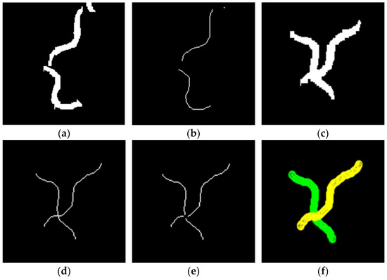 In contrast to non-colliding worms, the data of colliding worms cannot be directly correlated with trajectory fragments. In this paper, an improved skeleton method is employed for the segmentation of worms, as illustrated in Figure 4. Among them, Figure 4a shows the outlines of the two worms before the collision, and their skeleton information can be obtained using the traditional skeleton method, as shown in Figure 4b [15,16]. Subsequently, the worm collisions occur, as shown in Figure 4c. It can be seen that using the traditional skeleton method can only obtain a single skeleton, and the exact position of the colliding worms cannot be determined, as shown in Figure 4d. To solve this problem, the branchpoint of the traditional skeletons is removed, as shown in Figure 4e. At this point, there are four skeletons in the figure. Based on the skeleton length information recorded in Figure 4b, the most suitable skeleton combination is found using the dynamic matching method, as shown in Figure 4f [17]. Wherein, the green and yellow markers in the figure correspond to the separated worm skeletons. Comparing Figure 4d,f, it can be seen that the improved skeleton method effectively distinguishes the position of the collided worms.