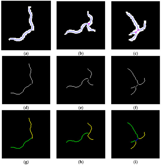 Subsequently, we applied the improved skeleton method to different worm collision situations, as shown in Figure 5a–c. The number of skeletons branchpoints is 0, 1, and 2, respectively. In Figure 5a–c, the white area is the worm blob, the blue curve is the result of the traditional skeleton algorithm, and the red dots are the branchpoints of the skeleton. After removing the branchpoints on the skeleton, as shown in Figure 5d–f, the skeleton in the figure is assigned using the dynamic matching method to obtain the most reasonable skeleton result, as shown in Figure 5g–i. Among them, green and yellow represent the skeletons of the two worms, and the blue line represents the area shared by the two worms. Once all the colliding worm fragments have been split, the method proposed in Section 2.4 should be employed to obtain the trajectory fragments.