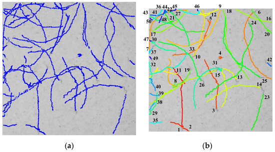 Experimental results of proposed multi-worm tracking method. (a). Output trajectory fragments of the intra-trajectory stage. (b) Output multi-worm trajectory of the inter-trajectory stage. The blue point in (a) is all the responses that were detected, the line of different color in (b) is different trajectories, and the number 1–50 is the ID of worms.