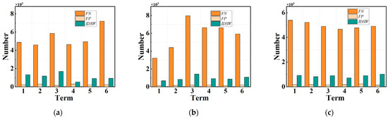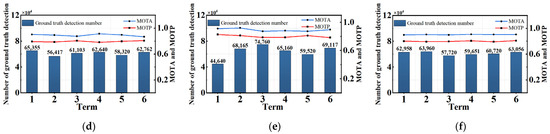 where and are the numbers of missed detection and false detection, is the number of true detections, and is the number of ID switches. The MOTP is defined as shown in Equation (15):