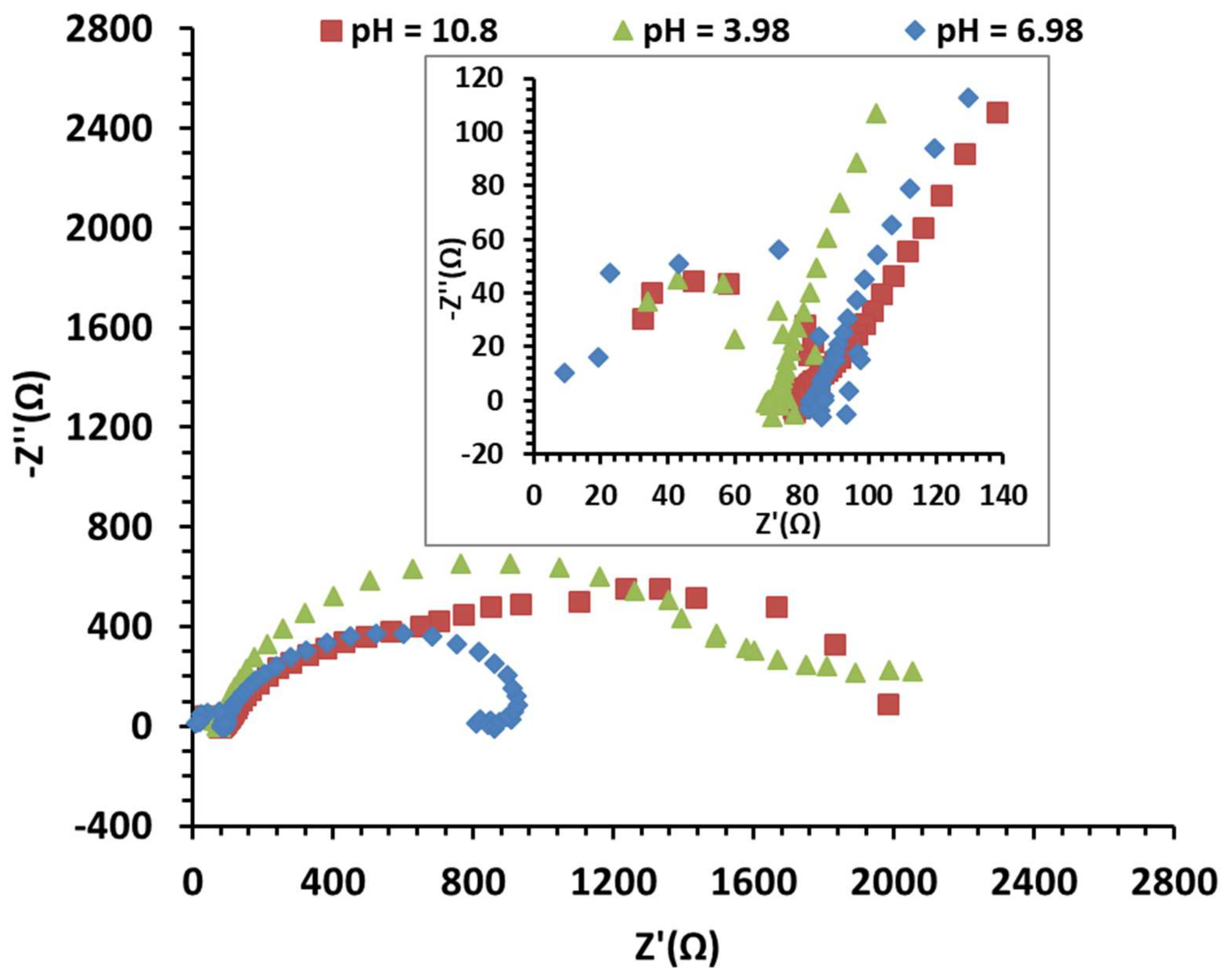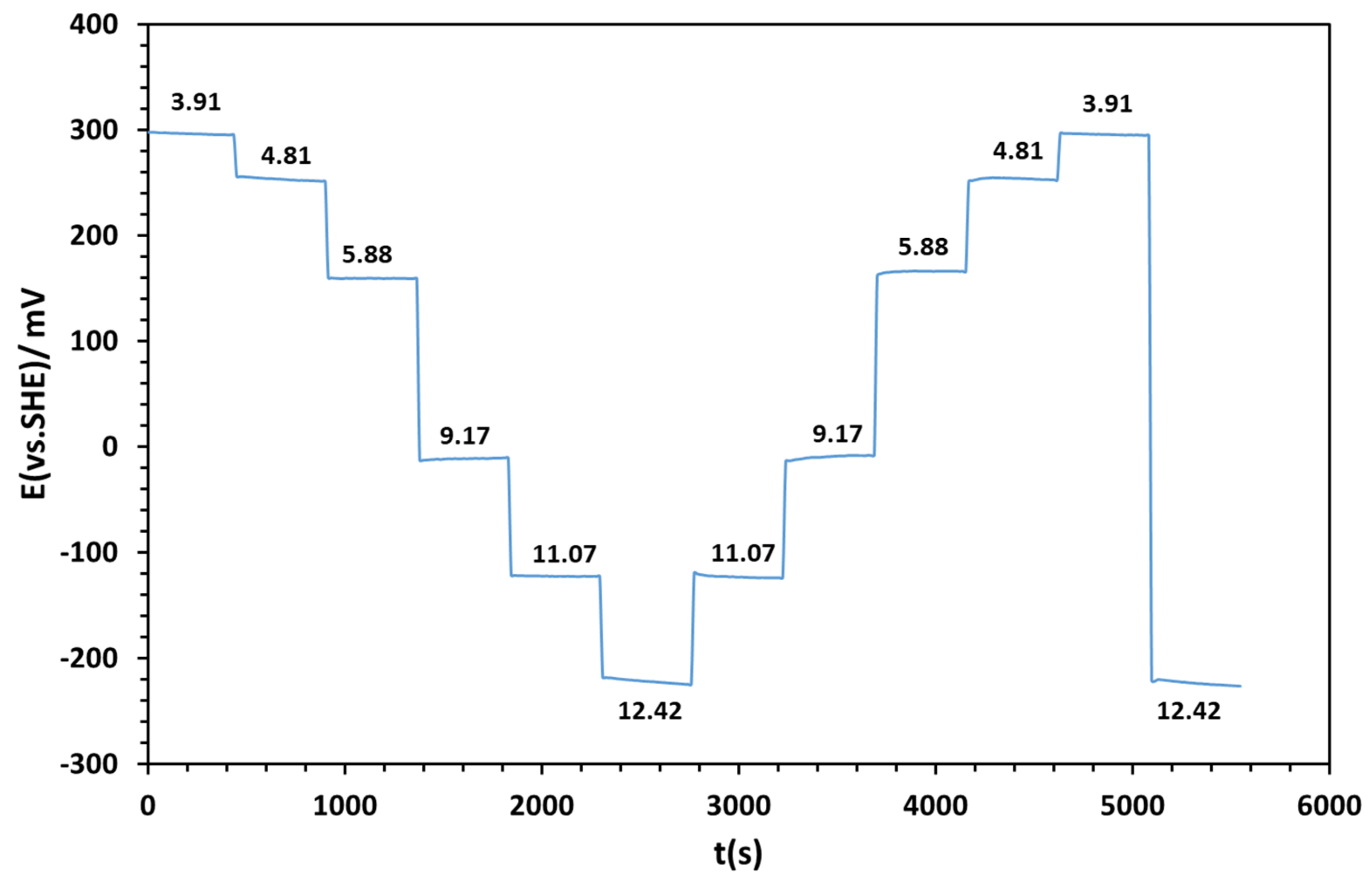 As otherwise stated, all the experiments were made in triplicate. Each experiment had its own measurements. Regardless of the experiment, pH reached a stable value in a few seconds. OCP reached a stable potential in the range of 1 to 2 min. For each experiment, the last ten values were used to calculate the mean and the relative standard deviation of OCP and pH. For each investigated pH value, the mean and standard deviation were calculated for ten measurements repeated three times (x = 10; N = 3). We have chosen to present only the first among the three experiments in the corresponding figure and we added the statistical treatments in a separate table.