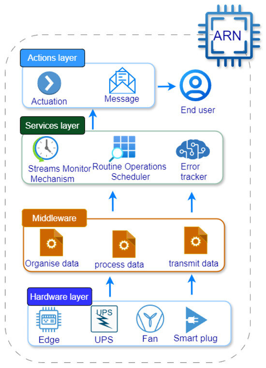 At the foundation of the ARN is the Hardware Layer, and it includes a lightweight controller, the Edge (e.g., Raspberry Pi), which collects and processes data at the building level (i.e., residence). This layer also features essential components like an Uninterruptible Power Supply (UPS) to guarantee a steady power supply, a Smart Plug for monitoring and managing the power usage of connected devices while controlling them when necessary, and a fan to cool the system, preventing overheating during intensive operations. These components establish a stable and reliable groundwork for data collection and basic system operations. The Middleware Layer focuses on data management, serving as an intermediary that organizes, stores, and processes data from the hardware. This layer enables seamless communication and data flow between the hardware and higher-level layers, ensuring that collected data are prepared for monitoring and analysis.