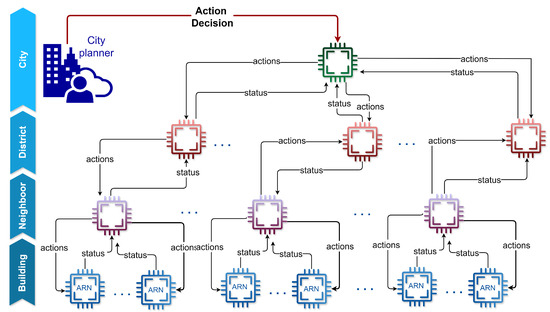 The hierarchical structure enables synchronized data flow from individual building-level ARNs to city-wide nodes, ensuring efficient resource management. Each ARN collects local data and passes summaries to the next level, such as neighborhood nodes, where data are aggregated and analyzed for broader trends. Higher-level nodes, such as city or district nodes, synchronize data across all connected ARNs, providing city-wide visibility of energy consumption and environmental conditions. Based on insights from aggregated data, upper-level nodes can initiate feedback commands to lower levels, optimizing resource distribution and balancing loads dynamically. This structure ensures continuous synchronization, adaptive control, and resilience in smart-city infrastructures by enabling efficient, real-time data flow and resource distribution at all levels.