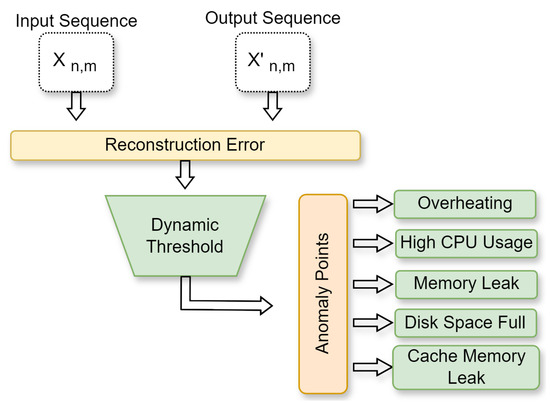Figure 4 illustrates the process of detecting anomaly points in a dataset. The inputs to the process are and . After the calculation of the reconstruction error, the dynamic thresholding process is applied. The output includes the features and the corresponding values where an anomaly point is detected.