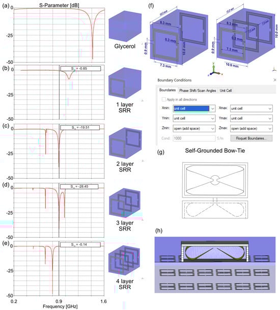 The number of square Split Ring Resonator (SRR) layers was varied from 1–4 using a unit cell (UC) with dimensions 10 × 10 × 15 mm3. S11–parameter is shown for (a) glycerol only with a thickness of 15 mm, (b) 1 layer, (c) 2 layers, (d) 3 layers, and (e) 4 layers of SRR immersed in glycerol with a total thickness of 15 mm. (f) Design of the 3D Metamaterial with 2 and 3 layers of SRR using UC boundary conditions. (g) Schematic of the Self–Grounded Bow–Tie antenna building block with top and side view. (h) Positioning of the SGBT antenna shown in (g) on top of the 3D Metamaterial containing the UCs shown in (d) (center cutting plane).