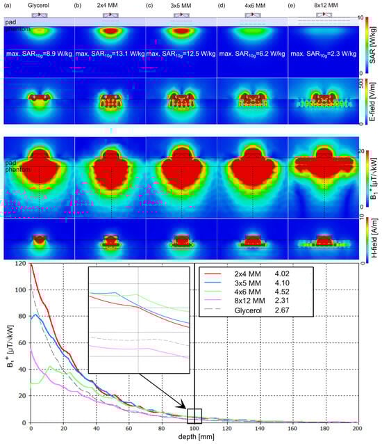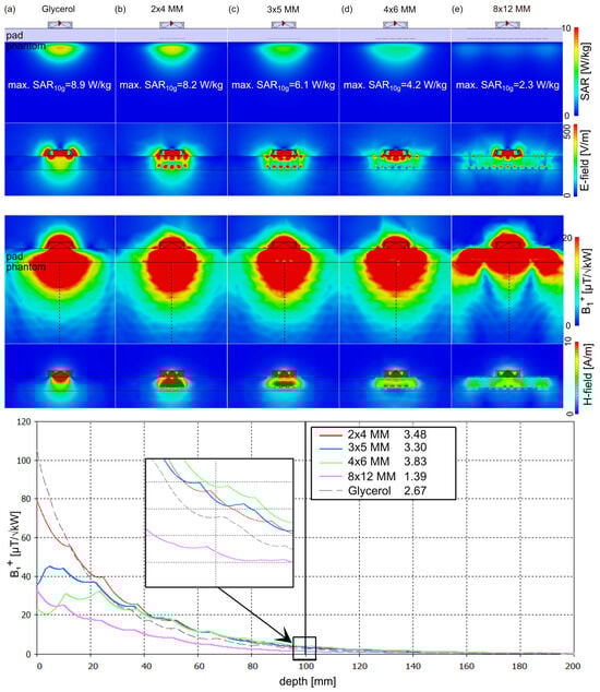 Assessment of the three layer SRR unit cell arrays using EMF simulations of a single SGBT antenna building block placed on a uniform phantom (εr = 37.5, σ = 0.7 S/m) using a (a) glycerol pad (200 × 200 × 20 mm3), and an array of (b) 2 × 4, (c) 3 × 5, (d) 4 × 6, and (e) 8 × 12 UC with three layers of SRR placed inside the large glycerol pad. (top) Maps of the Specific Absorption Rate averaged over 10 g (SAR10g) and E–field. (bottom) Transmission field (B1+) along a center line through the phantom (dashed black line) at 100 mm depth (zoomed view) and H–field. As a reference, the base– line configuration using a water pad provided a maximum SAR10g of 9.9 W/kg and B1+100mm of 2.2 µT/√kW.