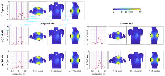 EMF simulations on Duke with one anterior and one posterior SGBT antenna building block (black) aligned with the center of the human heart using (a) a glycerol pad, (b) a 3 × 5 Metamaterial (MM), and (c) 4 × 6 MM inside the glycerol pad deploying two layers (left) of Split Ring Resonators (SRR) and three layers of SRR (right). Transmission field (B1+) maps are shown for the axial, coronal, and sagittal views through the center of the heart (marked in purple). On the left side, the B1+ along the red dashed line of the axial slice is shown with pink dotted lines depicting the border of the heart.