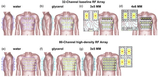 (a) Anterior and side view of the design and positioning of the baseline RF array configuration (32 Tx channels, top) and the high–density RF array (80 Tx channels, bottom). (a,e) A water pad was placed between the SGBT antennas and the chest walls of the human voxel model Duke. The use of glycerol (b–d,f,g) instead of lossy water resulted in a 1.2× increase in antenna size compared to (a,e). The proposed 3D Metamaterial immersed in glycerol was modeled as a (c,g) 3 × 5 (baseline RF array and high-density RF array) and (d) 4 × 6 array (baseline RF array) of unit cells consisting of three layers of SRR. A detailed, zoomed view of the MM setup with the antenna is shown next to the anterior view.