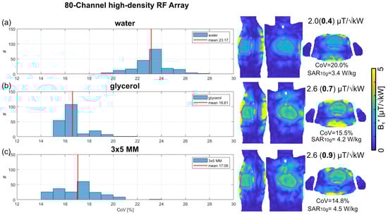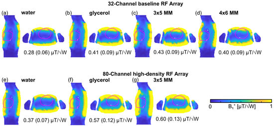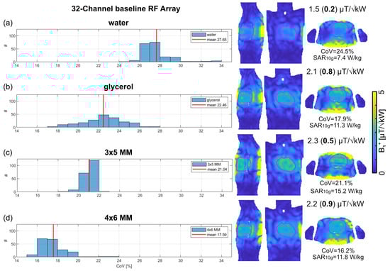 Notwithstanding the enhanced penetration depth and B1+ efficiency facilitated by the high-density RF array, destructive interferences can still occur without proper control of the EMF. To address this constraint, we performed B1+ shaping using dynamic pTx to achieve a uniform excitation of the whole heart without signal dropouts [,]. Replacing water with glycerol in conjunction with dynamic pTx improved the transmission field uniformity and efficiency of the 32-channel baseline configurations (Figure 7). The enhanced penetration depth of the 4 × 6 MM with three layers of SRR improved B1+ homogeneity and min. B1+ in the heart. For 200 optimizations, the 4 × 6 MM with three layers of SRR reduced mean CoV by −36% compared to the water setup, by −22% compared to the glycerol setup, and −16% compared to the 3 × 5 MM with three layers of SRR setup. Obtaining an excitation vector with the highest min. B1+ showed that the use of glycerol and the MM resulted in a SAR10g which exceeded the safety limits of 10 W/kg for local body RF arrays []. The 3 × 5 MM with three layers of SRR showed the highest SAR10g of 15.2 W/kg, which is in accordance with the results obtained for the single SGBT building blocks. For the 32-channel baseline RF array, the 4 × 6 MM with three layers of SRR showed the highest min. (B1+) = 0.9 µT/√kW with CoV = 16.2% and max. SAR10g = 11.8 W/kg (Figure 7).