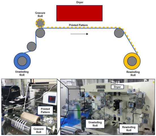 Schematic (top) and pictures (bottom) of roll-to-roll gravure printing process.