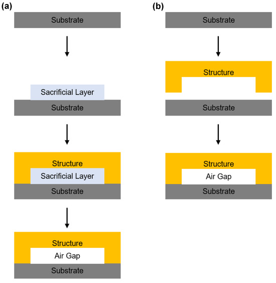 MEMS air gap structure fabrication processes. (a) Schematics showing sacrificial layer removal method and (b) transferring and bonding method.