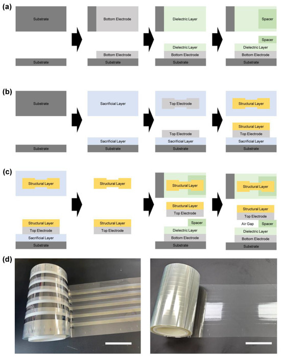 Fabrication of touch sensor samples. (a) Schematics showing fabrication sequence of lower part; (b) schematics showing fabrication sequence of upper part; (c) schematics showing delamination, transferring, and bonding of upper part; (d) roll-to-roll gravure-printed top electrode and dielectric layer (left) and roll-to-roll gravure-printed sacrificial layer (right). The scale bars are 100 mm.