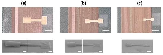 The miniaturization of sensors is accelerating due to their advantages, including space efficiency, enhanced integration with system-on-chip (SoC) designs, low cost, light weight, and applicability across a wide range of applications [1,2,3,4,5]. These sensors are typically fabricated using the microelectromechanical systems (MEMS) process and encompass various types, including touch/pressure sensors, accelerometers, gyroscopes, temperature sensors, and gas sensors [6,7,8]. However, achieving sensor miniaturization necessitates a careful consideration of challenges such as performance degradation, reproducibility, and the complexity of the manufacturing process [9,10,11,12,13].