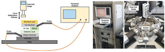 The characteristics of the touch sensor samples were evaluated as shown in Figure 5. The sensor samples were first mounted on the stage of the probe station, and two probes in the probe station were put in contact with the bottom and top electrodes. Then, a push–pull gauge mounted on a motorized stand was moved up or down to apply force to the sensor samples. The force applied to the sensors via the push–pull gauge and the capacitance values obtained for the sensor samples were recorded in real time in the analyzer. The frequency of the parameter analyzer was 1 MHz.