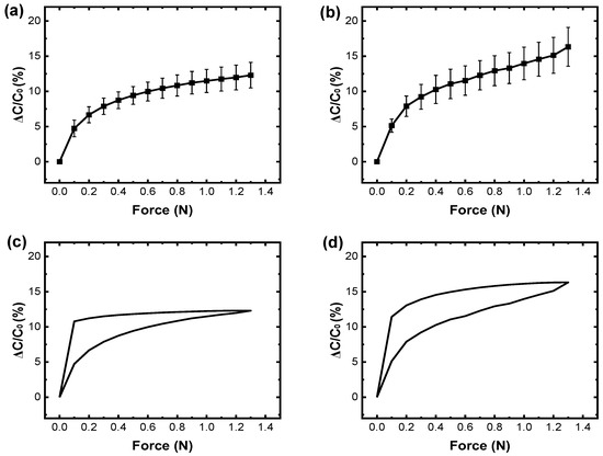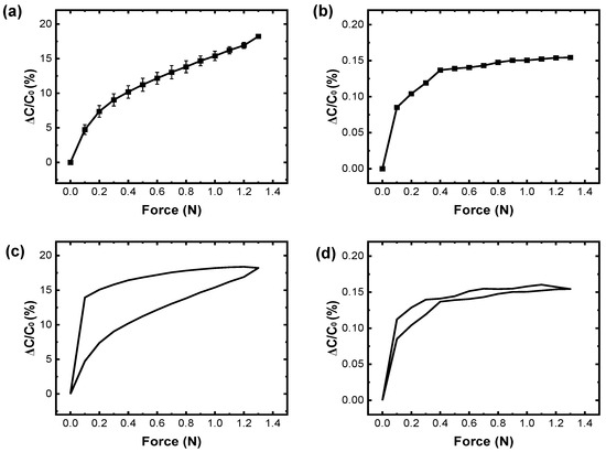 In this study, we additionally evaluated the sensor samples’ hysteresis characteristics. To obtain the hysteresis curves for the sensor samples, the push–pull gauge mounted on the motorized stand applied force at a rate of 0.4 µm/s up to a maximum of 1.3 N and then released the force back to 0 N at the same rate. The capacitance values of the sensors were measured and recorded in real time during this process. The obtained data were substituted into Equations (3) and (4) to calculate the maximum hysteresis value [47,48].