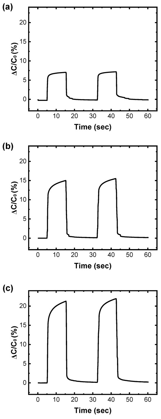 Finally, the response times were obtained for the SU-8-based small-area, medium-area, and large-area sensor samples from the switching plots shown in Figure 8a, 8b, and 8c, respectively. The average capacitance changes for the small-area touch sensor samples increased under a force of 1.3 N held for 10 s and decreased when the force was released (Figure 8a). The average response time of the small-area touch sensor samples was 280 ms (Figure 8a and Table 4). Similarly, the medium-area touch sensor samples exhibited an average response time of 280 ms (Figure 8b and Table 4). The large-area touch sensor samples followed the same trend, with an average response time of 310 ms (Figure 8b and Table 4). The difference in the area of our sensor samples did not appear to significantly affect the response speed (Figure 8 and Table 4).