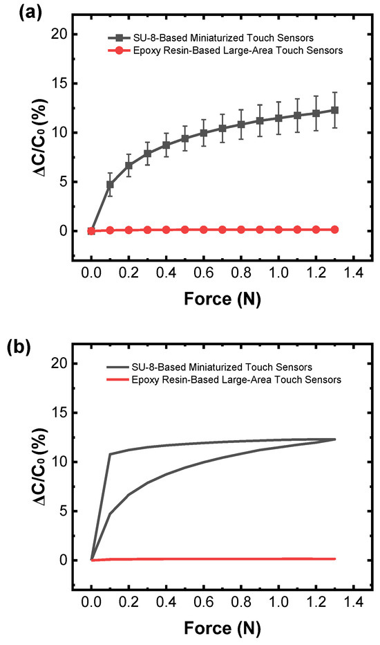First, for the comparative analysis of sensitivity, the relationship between capacitance changes and force is shown in Figure 9a. In the linear region, the average sensitivity of the SU-8-based small-area touch sensor samples was 67 times higher than that of the epoxy-based large-area touch sensor samples. In the saturation region, the average sensitivity of the SU-8-based small-area touch sensor samples was 189 times higher than that of the epoxy-based large-area touch sensor samples.