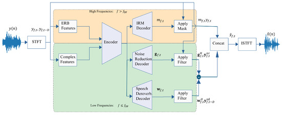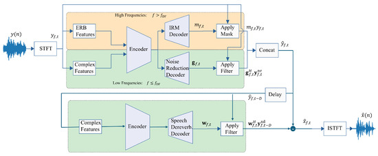 Deep Filter Net [25,26,27] combines deep filtering with IRM to achieve high performance while maintaining a lightweight architecture, primarily focusing on noise reduction. Deep Filter Net recognizes the distinct impact of noise at different frequencies. IRM provides sufficient noise reduction in high frequencies, where noise mainly corrupts the speech envelope. Conversely, deep filtering is employed for more effective noise suppression in low frequencies, where periodic noise components can mix with speech harmonics, especially for transient noises.