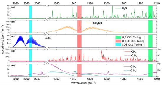 Absorption spectra of the target analytes (1 ppm-m, 25 °C, 1 bar) along with the tuning range of the employed QCLs. (a) H2S, (b) CH3SH, and (c) COS. Absorption spectra of the most important hydrocarbon matrices are plotted for CH4 and C2H6 in (d) and for C3H6 and C3H8 in (e). All spectra are taken from the PNNL database.