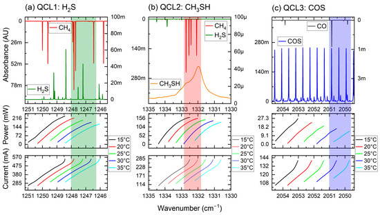 For the selection of the most suitable range for the detailed and optimum spectral detection of each target analyte, reference spectra at a reduced pressure of 100 mbar were calculated [31] based on the HITRAN [32] database. In addition, spectral simulations of available reference gas cell fillings (i.e., CH4 for the H2S and CH3SH channels and CO for the COS channel) for implemented wavelength tracking are supplemented. The emitted wavenumber and attributed power of each QCL channel, depending on the operation parameters, are plotted in Figure 2a–c, and spectra of the target analytes reference cell analytes, along with the designated operational area, are shown. As indicated by the shaded area of each laser channel, the designated operational spectral window can be reached with moderate TEC current settings (i.e., operational points are within 20–30 °C). In addition, the high laser optical output power can still be leveraged for the usage in the beam combination module.