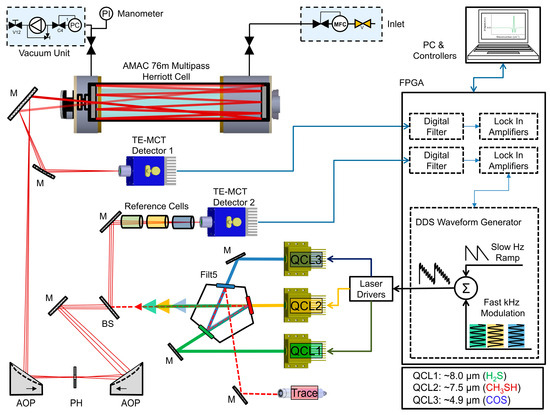 The individual filters (H2S:FB8000-500, CH3SH: FB7500–500, COS: FB4750-500, Thorlabs, Dortmund, Germany) transmit the specified wavelength band (T > 0.8), while effectively reflecting (R >> 0.95) out-of-band emission and blocking unwanted radiation. In this fashion, all three individual emitters are co-aligned with two gold mirrors (PF-10-M03, Thorlabs, Newton, NJ, USA) in a Z-fold configuration. The resulting collimated and multiplexed laser beam is split into a reference and signal path (CaF2 window, 95:5 splitting ratio, Thorlabs) before being spatially filtered, mode matched, and coupled into an astigmatic 76 m Herriott multipass cell (AMAC76-LW, Aerodyne Inc., Billerica, MA, USA). The exiting beam is subsequently focused onto an optically immersed, thermoelectrically cooled mercury–cadmium–telluride (MCT) detector (PVI-4TE-12, Vigo Systems, Ożarów Mazowiecki, Poland). The reference path is equipped with a second MCT detector (PCI-4TE-9, Vigo Systems) as well as with methane (CH4), hydrogen sulfide (H2S), and carbon monoxide (CO) reference gas cells (Wavelength References, Corvallis, OR, USA) for accurate wavelength calibration and laser drift compensation. The detector signals are digitized, demodulated, and further processed using a self-developed multi-channel filtering and lock-in amplifier chain implemented in FPGA hardware (NI 7856R, National Instruments, Austin, TX, USA). The optical layout of the triple-QCL sensor is outlined in Figure 3.