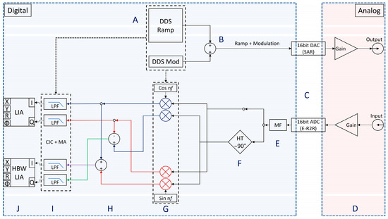 Schematic of the FPGA implementation with different functional submodules: Direct digital waveform generation (A,B), DAC output and ADC input (C,D), digital filtering (E,F), digital lock-in amplifier stages (G,H) and subsequent low pass filtering stages (I,J).