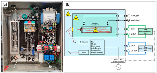 In order to meet on-site safety regulations, the three-channel QCL sensor platform is installed in a purged and pressurized (EXp) industry enclosure (KE 9408.600, Rittal, Wetzlar, Germany) and equipped with the required safety infrastructure (EPV 5500, P&F, Mannheim, Germany) allowing a certified operation under ATEX/IECEx regulations for hazardous and explosive environments (Figure 5). This method of explosion protection is the technique of choice which ensures that the differential pressure of a protective gas (N2, instrument air) inside an EXp enclosure is sufficient to prevent the ingress of a flammable gas, vapor, dust, and fiber, and prevent a possible ignition [36].