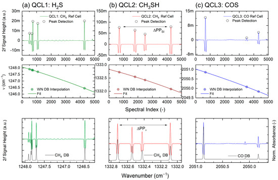 The reference path arm (Figure 3), equipped with the matching reference cell for each laser, is used for spectral and power monitoring. The digitized harmonic spectra are constantly evaluated and serve as input for a wavenumber tracking procedure. Wavenumber tracking and subsequent interpolation can be successfully implemented after peak detection and peak identification via the database of the recorded 2f-WMS reference cell spectrum are performed. In a first step, the lock-in time position (spectral index) of the detected peaks is extracted and correlated with the matching wavenumber positions of the corresponding database peaks. The resulting spectral index–wavenumber pairs are least squares fitted with appropriate low-order polynomials (n < 3). In a last step, the original linear spectral index vector is now exchanged with the non-linear tuning fit wavenumber vector. The procedure is outlined in Figure 6.