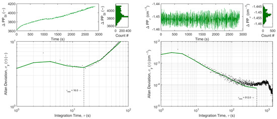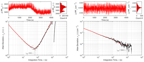 In order to compare the effects of the wavenumber tracking with its benefits of absolute spectral positioning and stabilized wavenumber output of the sensor, the position differences in the first and last detected peaks in each scan in terms of the spectral index (ΔPPSI, free-running operation) and wavenumber (ΔPPν, tracked and interpolated operation) are recorded for a duration of 4000 s. Allan–Werle deviation plots of the position differences are shown in Figure 7 for the CH3SH QCL in free-running (left) and tracked operation (right).