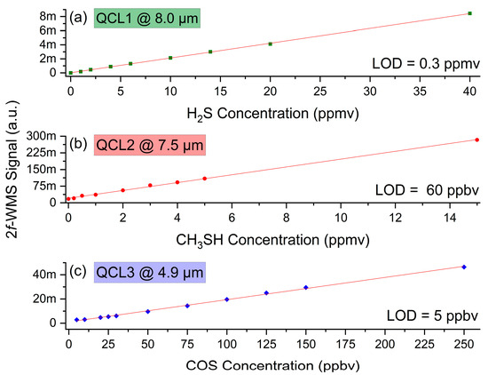 The first step towards a successful multi-analyte detection was the evaluation of selectivity and sensitivity. Quantitative measurements of H2S, CH3SH, and COS, were performed using calibration gas mixtures in nitrogen (N2), methane (CH4), and propene (C3H6) matrices to investigate the sensitivity and linear response of the 2f-WMS-based triple-QCL sensor system. Different target analyte concentration levels were prepared by dilution from these standardized gas bottles with their respective main matrix component using a mass flow and pressure-controlled in-house-developed gas handling system. The sensor was operated with the multipass cell at room temperature (22 ± 2.5 °C), flow rates varying from 0.1 to 1.0 L/min, and a total pressure ranging from 15 mbar to 100 mbar, enabling the spectral resolution of the ro-vibrational bands of both the analyte and matrix molecules.