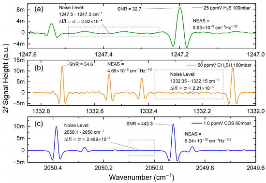 For the NEAS determination, 2f-WMS spectra of 25 ppmv H2S, 50 ppmv CH3SH, and 1.0 ppmv COS were recorded with a lock-in time constant of 2 ms, a filter slope (roll-off) of 24 dB/octave, and within a single shot measurement (no averages), which resulted in a noise-equivalent bandwidth of the low-pass filter of 39 Hz. The results are plotted in Figure 10 and the calculated values of the NEAS for each analyte are listed in Table 2.