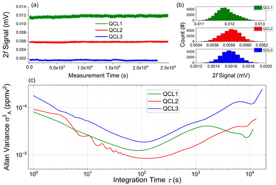 (a) Time series measurements of constant analyte concentrations for over 7 h. (b) Histograms of the time series measurements. (c) Determination of the Allan variance as function of integration time: QCL1: H2S (green); QCL2: CH3SH (red); QCL3: COS (blue).