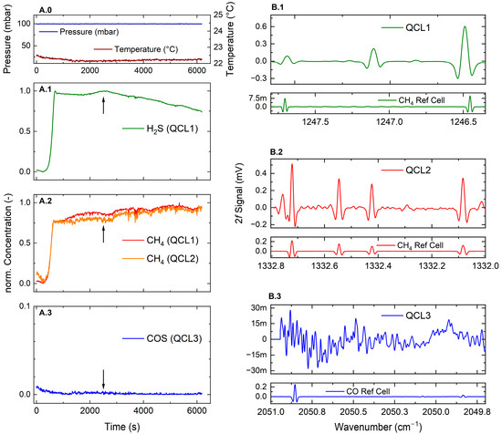 Time series measurements (Panel A) and detailed snap-shots of the spectral composition of each laser channel (Panel B): QCL1: H2S (green); QCL2: CH4 (red); QCL3: COS (blue).
