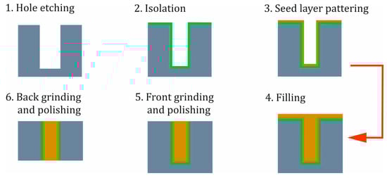 Absolute pressure sensors require a hermetically sealed cavity as a reference pressure chamber. In some cases, it is also necessary to protect the sensor from the measured medium. However, packaging is often a limiting factor, especially when it comes to transferring a product from design concepts to functional prototypes and finally to series production [34]. Anodic bonding, silicon–silicon direct bonding, and glass frit bonding are the most important methods for producing the sealed cavity. These packaging methods require complex equipment, high process temperatures, high voltage, and critical pretreatments [31,32]. Silicon stacking technologies or three-dimensionally integrated systems in a package (3D-SiP), which are based on the use of silicon TSVs, are another option [35]. In addition to creating a hermetically sealed cavity, TSVs offer the possibility of improving the performance, functionality, and density of integrated circuits (ICs) [36]. This enables the production of miniaturized, media-resistant sensors with higher temperature stability. However, this is usually associated with increased effort and costs. In general, TSVs are manufactured by etching trenches in silicon and then filling them sequentially with insulating and conductive materials [34,35,36,37,38] (Figure 1). The manufacturing process involves further critical process steps such as annealing to remove stress between the materials, high-temperature diffusion processes, grinding, and polishing.