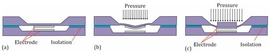Compared to piezoresistive sensors, capacitive sensors exhibit a significantly lower temperature drift since their capacitance is typically not influenced by diffusion processes. Capacitive sensors are commonly designed as parallel-plate capacitors [1,23]. Pressure changes deform the sensitive membrane, altering the electrode gap or the dielectric properties (i.e., the relative dielectric constant εr) of the medium between the plates, thereby affecting the capacitance. Capacitive pressure sensors are versatile, covering a wide pressure range from as low as 250 Pa to high pressures up to 70 MPa [21]. They offer several advantages, including high pressure sensitivity, excellent accuracy, low power consumption, and robust shock resistance [28,29]. However, challenges arise from parasitic and stray capacitances, which complicate capacitance measurements and the linearization of output signals [30]. Additionally, their fabrication often involves intricate packaging methods such as anodic bonding, silicon–silicon direct bonding (fusion), and glass frit bonding [31,32]. These bonding methods also present difficulties in establishing reliable electrical connections between the sensor electrodes and contact pads, which remains a significant challenge in the design and manufacturing of these sensors [31].