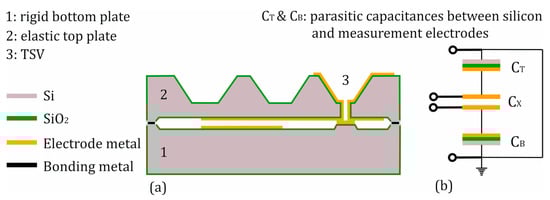 The chip components are bonded together through eutectic bonding. Compared to other bonding methods such as silicon–silicon direct bonding, glass frit bonding, and anodic bonding, eutectic bonding does not require complex facilities, high voltage, or critical pretreatments [31,32]. Additionally, eutectic bonding exhibits a very high mechanical strength. For instance, the tensile strength is approximately 250 MPa for a Au-Si eutectic and around 140 MPa for an Al-Si eutectic [47,48]. Furthermore, eutectic bonding welds both sensor components together, mechanically and electrically connecting them. Additionally, the eutectic bonding process enables operation at higher temperatures of up to 500 °C for aluminum–silicon eutectic bonds [33] and up to 350 °C for gold–silicon shown in this publication. As a result, the capacitive measuring cell is surrounded by silicon material, which is a crucial aspect of this design. The silicon material forms a third electrode, which, along with the measuring electrodes, creates parasitic capacitances. This third electrode can be brought to a defined potential, allowing direct tapping of the measuring electrodes (floating mode) and avoiding the influence of parasitic capacitances on the measurement signal. Consequently, the output signal exhibits a much higher signal swing compared to conventional capacitive sensors. Furthermore, the silicon material forms a Faraday cage around the sensing electrodes, shielding the sensor against external electrostatic disturbances. Figure 4b depicts a schematic of the sensor’s equivalent circuit.