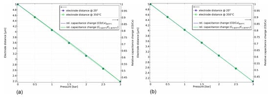 The sensor performance shows that the 100% capacitance change is achieved at a displacement of 2.503 µm (half of the electrode distance) for the sensor with an anvil and 2.566 µm without an anvil. This in turn confirms the improved linearity of the capacitance–pressure characteristic, as shown in Figure 6.