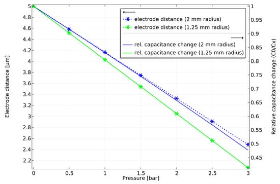 In the model, a sensor with an anvil and 85 µm diaphragm thickness was compared with a sensor without an anvil and 160 µm diaphragm thickness. The diaphragm thickness was purposely chosen differently so that both sensors have approximately the same maximum measuring range of 2.55 bar. The maximum measuring range is defined by the 100% change in capacitance. As explained in the previous section, reinforcing the center of the membrane with an anvil results in the center increasing in stiffness compared to the edge and the electrode in the center being only minimally deformed under the applied pressure. Figure 5 illustrates this result and shows that the deflection of the membrane electrode with an anvil is more homogeneous and uniform over the entire electrode surface than with the sensor without an anvil.