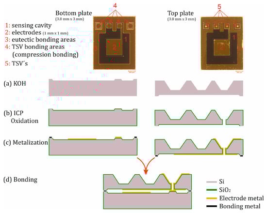 In process step (c), the front side of the bottom plate and both sides of the top plate are metalized and structured. Spin coating in the lithography step of structures with a high aspect ratio like the back side of the top wafer is generally a challenge. The open TSVs also increase the complexity. To overcome this, the metallization of the front side of the top wafer was first performed by sputtering followed by a spin coating of the positive resist (AZ 1518 Microchemicals GmbH, Ulm, Germany), lithography, and wet-chemical metal etching. In a second step, the backside was treated with a bi-layer lift-off process (LOR 5A resist by micro resist technology GmbH, Berlin, Germany, and AZ 1518 Microchemicals GmbH, Ulm, Germany), followed by sputter metallization. This method enabled the successful metallization of the TSVs. This fabrication step led to some defects due to improper resist coating, which did not affect functionality. Nevertheless, resist deposition will be conducted by spray coating as soon as the equipment is available in our lab. Since the eutectic bonding occurs at the edges of the sensor cell, only the eutectic metal (Au) without oxides and adhesion layers is deposited and structured in this area. Therefore, the metallization step is carried out in two stages. Firstly, the electrodes, conductive paths, and TSV contact areas are coated with a suitable high-temperature adhesion and diffusion barrier layer, such as titanium–tungsten. In the second step, the eutectic metal is deposited. During the metallization of the front and back sides of the top plate, the insulated side wall of the TSVs is also metalized. Thus, in this step, an insulated capacitive sensor electrode, the insulated bonding area of the TSVs, and a metalized chip edge without insulation are structured. Finally, the top plate is aligned with the bottom plate, and they are bonded together by eutectic bonding (Figure 8d). Eutectic bonding has the advantage of fusing the bottom and top chips together, thus electrically and mechanically connecting them. As a result, the capacitive sensing cell is surrounded by silicon material, forming a Faraday cage around the sensing electrodes. With that, the sensor is shielded against external electrostatic disturbances. Another advantage of eutectic bonding is an operating temperature of up to 350 °C when Au is used as the eutectic metal. To increase the operating temperature to up to 500 °C, aluminum is used instead of gold. The electrodes are routed via a conductive path to the contact areas of the TSVs. Additionally, the TSV contact areas on the inner sides of both chips are simultaneously sealed during the bonding process. The pressure and temperature required for eutectic bonding bring the surfaces of the metal layers at the TSV contact areas of the bottom and top plates into direct contact and tightly compress them. This results in a solid mechanical connection known as a compression bond. When using gold, the layers are additionally welded together through the diffusion of gold atoms between the layers. This results in a metallurgical connection at the atomic level known as a diffusion bond [49]. Therefore, the hermetic sealing of the sensor is achieved through compression bonding or diffusion bonding at the TSV contact areas and through eutectic bonding at the outer edges of the sensing cells. The eutectic connection also ensures that the contact pressure at the TSV contact surface is maintained after solidification, providing additional strength. Furthermore, this combination of bonding techniques enables the production of sensors with high precision, reliability, and a high degree of sealing.
