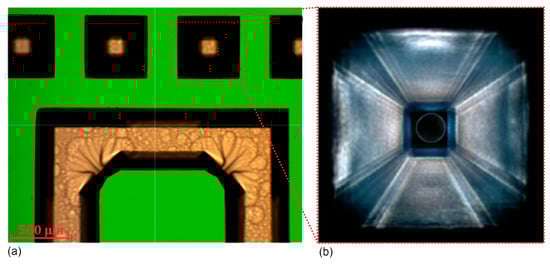Top view of the backside of the top plate (a) after the KOH etch process and (b) of a TSV after opening the TSV hole by dry etching.